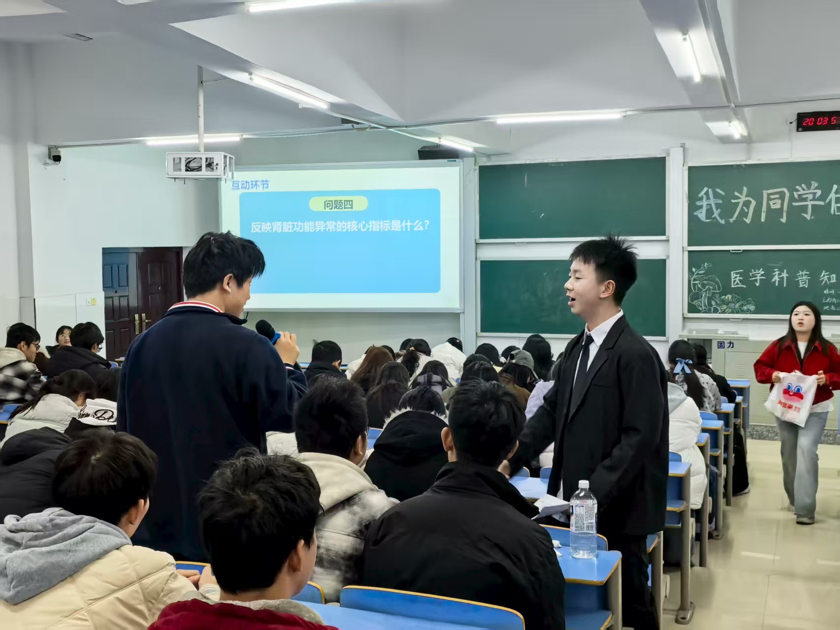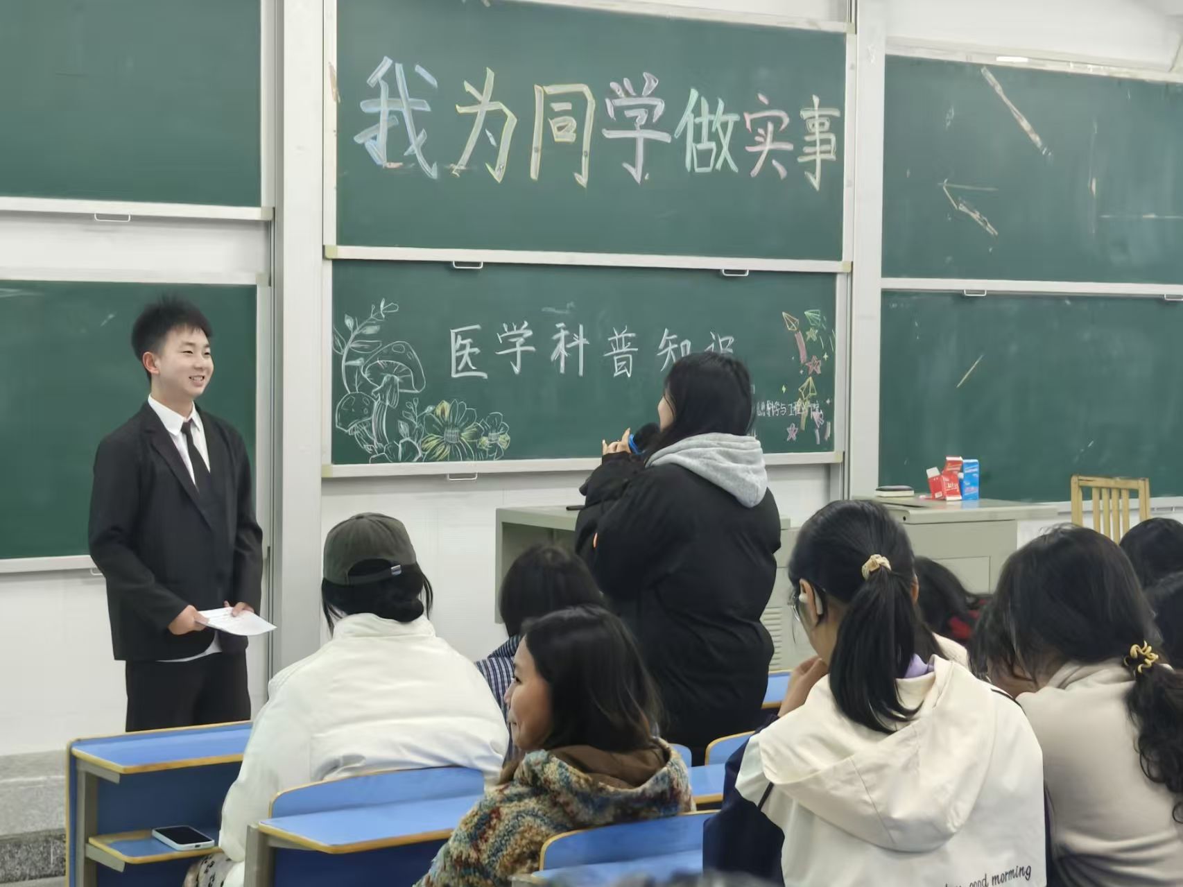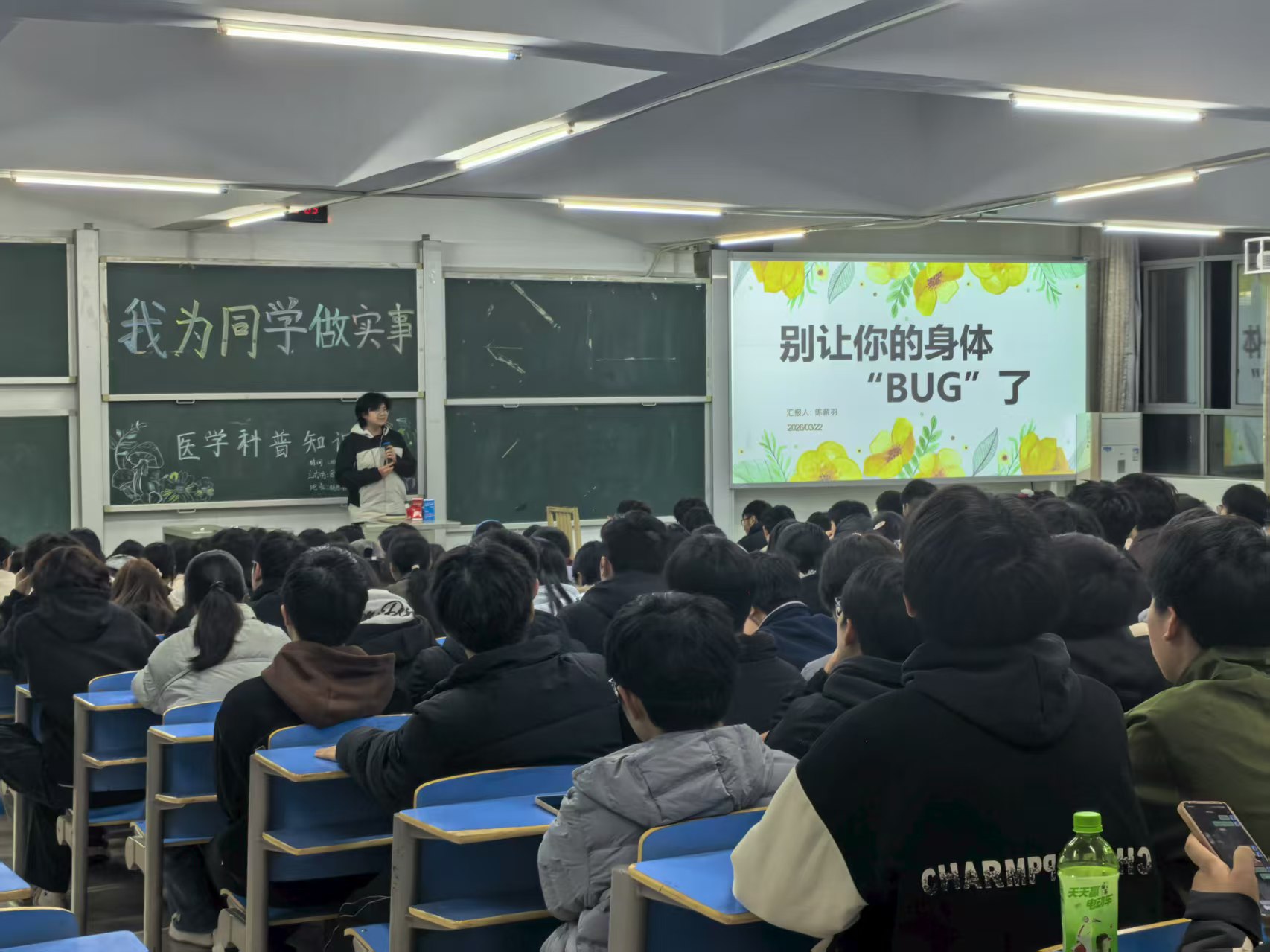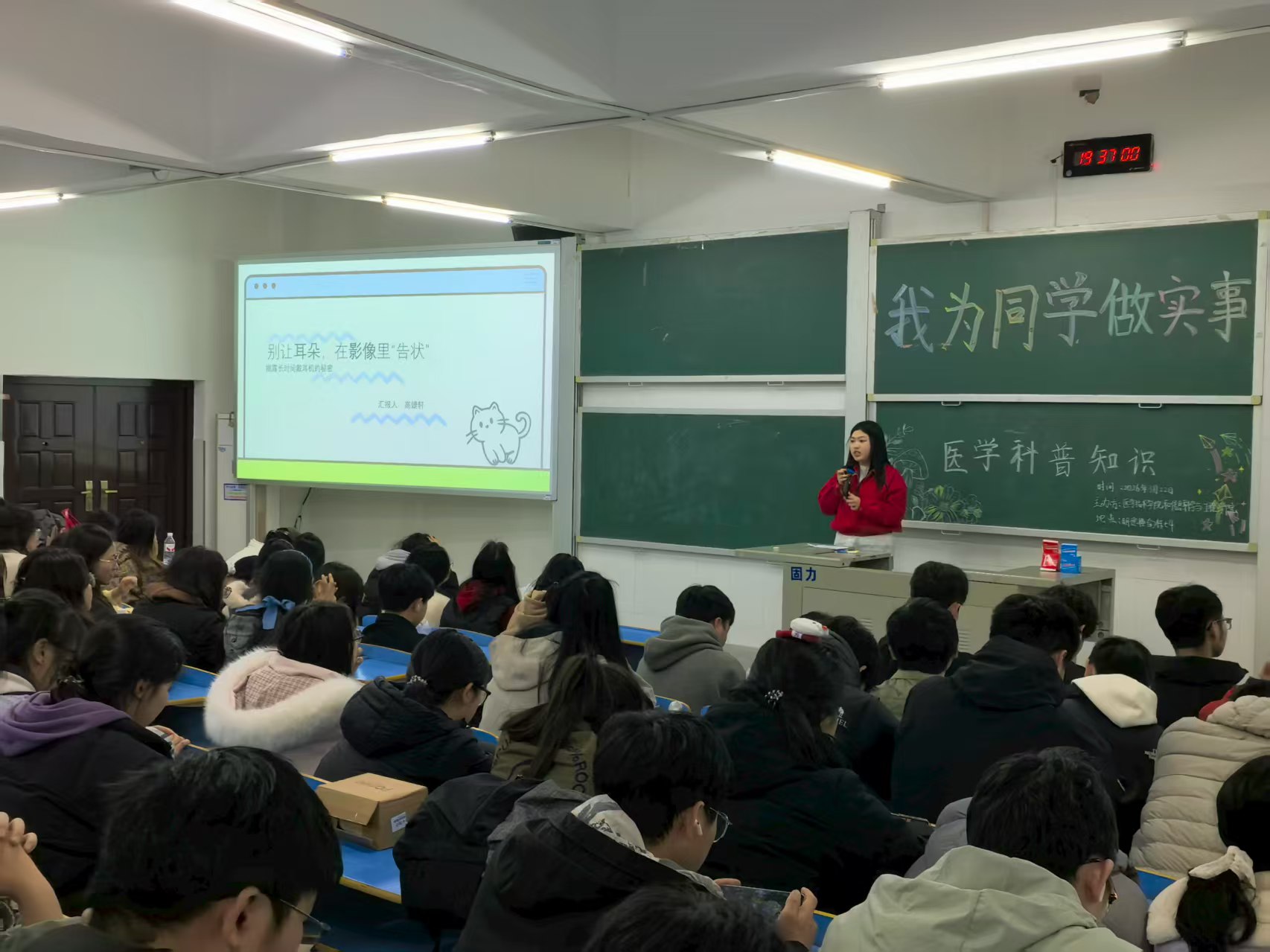 同日晚间,医学技术学院学生科普团队走进信息工程学院,开展了以“医学科普进工科”为主题的健康宣讲活动。宣讲围绕四个贴近大学生生活的健康话题展开:“耳机对耳朵的危害”,提醒同学们警惕长期佩戴耳机带来的听力损伤;“日常姿势纠正与体态管理”,通过现场示范帮助同学们改善因久坐、低头等不良习惯造成的体态问题;“采血管的颜色秘密”,趣味解读不同颜色采血管对应的检测项目,消除同学们对体检采血的陌生感与紧张情绪;“别让你的身体‘BUG’了”,则从如何看懂化验单入手,引导大家学会用科学的方式关注自身健康状况。本次活动充分发挥医学专业特点和优势,将志愿服务与劳动教育实践紧密结合,展现了党员教师、学生党员、入党积极分子及学生干部在服务师生中的先锋模范作用。