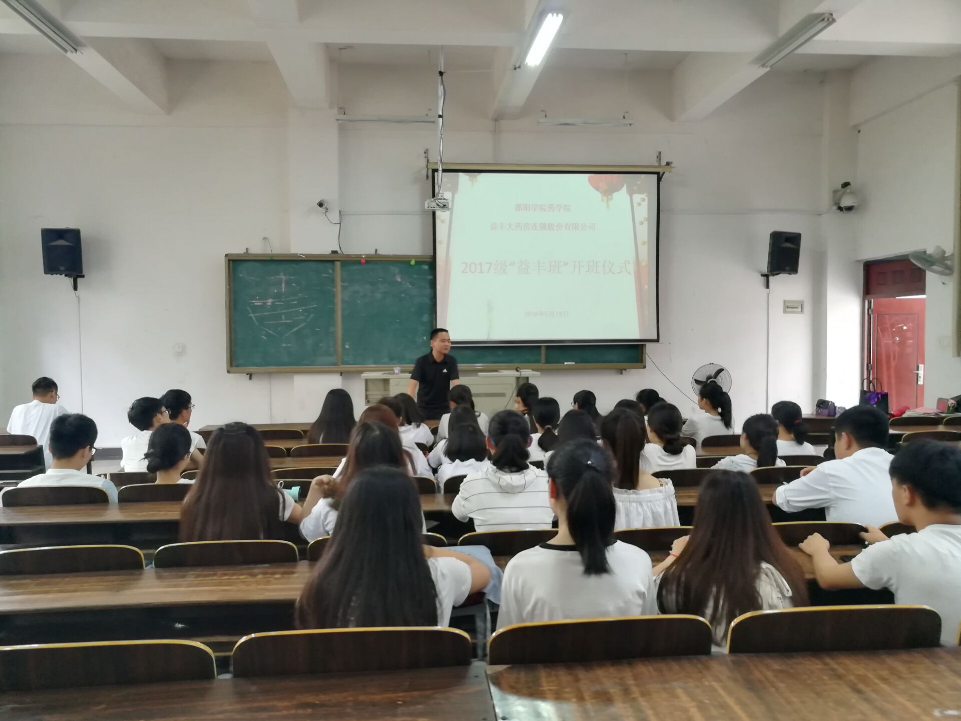 为深入开展校企合作,扩大药学院学生就业实习平台,药学院与湖南益丰大药房连锁股份有限公司成为校企合作伙伴,双方于2018年5月18日在七里坪校区慎思楼南201教室隆重举行2017级“益丰班”开班仪式。药学院党总支副书记张红萍教授、17级辅导员黄慧老师、益丰大药房连锁股份有限公司刘总、邵阳分公司主管艾女士等人参加开班仪式。