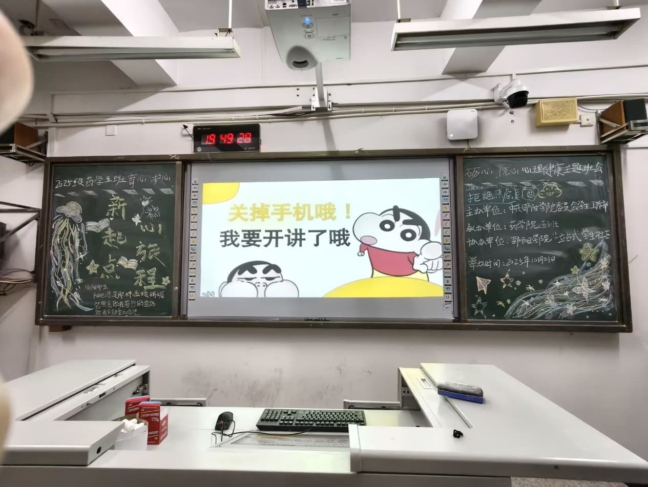 活动前期,药学院心理健康教育互助部精心筹备,一方面与学校心理健康中心积极对接,确定济世楼南 102 成长辅导室、南 209 团体辅导室的参观时间与讲解安排,让新生提前熟悉心理健康服务资源;另一方面,组织院心健部干事与各班心理委员进行工作交接,明确班会流程与分工,同时鼓励各班结合专业特色,筹备 PPT 讲解内容与文艺节目,为班会营造轻松温馨的氛围。此外,各班还提前邀请辅导员、班主任参与,并围绕 “育心、护心、砺心、悦心” 主题设计黑板报,为活动开展做好充分准备。