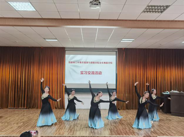 活动第二阶段是由全体实习生以及邵阳市第二中学在读学生进行交流演出,展现双方的音乐实力,使学生和实习老师之间增进了解。实习生给我们展示了心惊胆战的游击战、地道战、地雷战,英勇的八路军战士形象《游击队之歌》,以及那让全场都嗨起来的爵士乐《mercy》,获得领导的一致赞赏。舞蹈实习生带来了让人赏心悦目的《胶州秧歌》、古典舞《韵》以及令人倍感欢快的《维族舞蹈》,向领导们展现了他们扎实的舞蹈功底。由我院器乐专业学生带来的合奏《双面燕洵》、小组唱《明天会更好》也给在座的领导及老师留下深刻的印象。