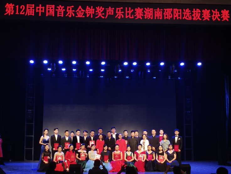 2019年4月20日至21日,第十二届中国音乐金钟奖声乐比赛邵阳选拔赛在邵阳学院星光剧院隆重举行。中国音乐金钟奖是中共中央宣传部批准设立、由中国文联和中国音协共同主办的中国音乐界综合性专业大奖。本次选拔赛由邵阳市音乐家协会主办,邵阳市音乐家协会声乐专业委员会邵阳学院音乐舞蹈学院承办,参赛选手近200人,分美声、民族两个组别进行比赛,共决出美声、民族金奖各2名、银奖各3名、铜奖各5名、优胜奖各5名以及优秀指导奖、优秀指导师若干,其中美声、民族组前6名将被选送参加省赛。