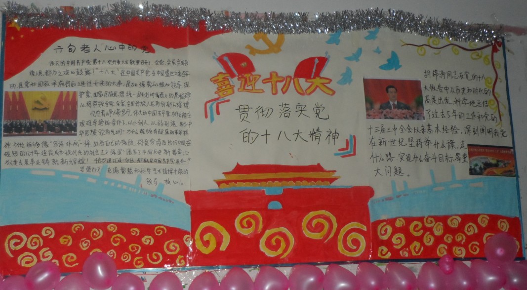 在此次墙报的制作过程中,各班同学以高度的责任感和强烈的责任心积极准备,精心设计,集思广益,认真挑选出有关十八大的相关知识和最新消息作为墙报内容。在制作、设计、书写墙报的过程中,同学们不仅自己学到了很多有关党代会的知识,也通过墙报这个宣传阵地让更多的同学关注和学习了党的十八大精神。