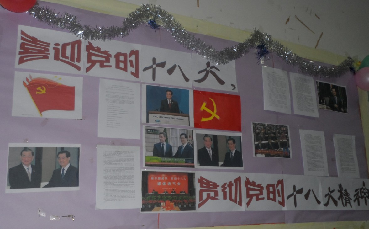 2012年11月29日晚,为了增强同学们对十八大会议精神的关注意识,提高同学们的政治素养,我系2012级全体学生以班级为单位开展“学习十八大”的红色墙报评比活动。