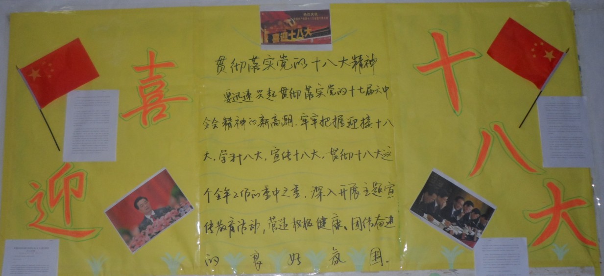 在此次墙报的制作过程中,各班同学以高度的责任感和强烈的责任心积极准备,精心设计,集思广益,认真挑选出有关十八大的相关知识和最新消息作为墙报内容。在制作、设计、书写墙报的过程中,同学们不仅自己学到了很多有关党代会的知识,也通过“墙报”这个宣传阵地让更多的同学关注和学习了党的十八大精神。