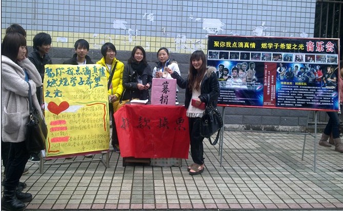 为了将此次义演的影响推向全院,从3月1号开始,我系社会实践部的同学,在全院学生比较集中的地方,支上展板,宣传介绍爱心社和“wonderful”乐团的义演性质和节目内容,并多处设点预售演出会门票。票面不限定价格,多少都投入募捐箱,作为观众对寒门学子的第一份爱心。