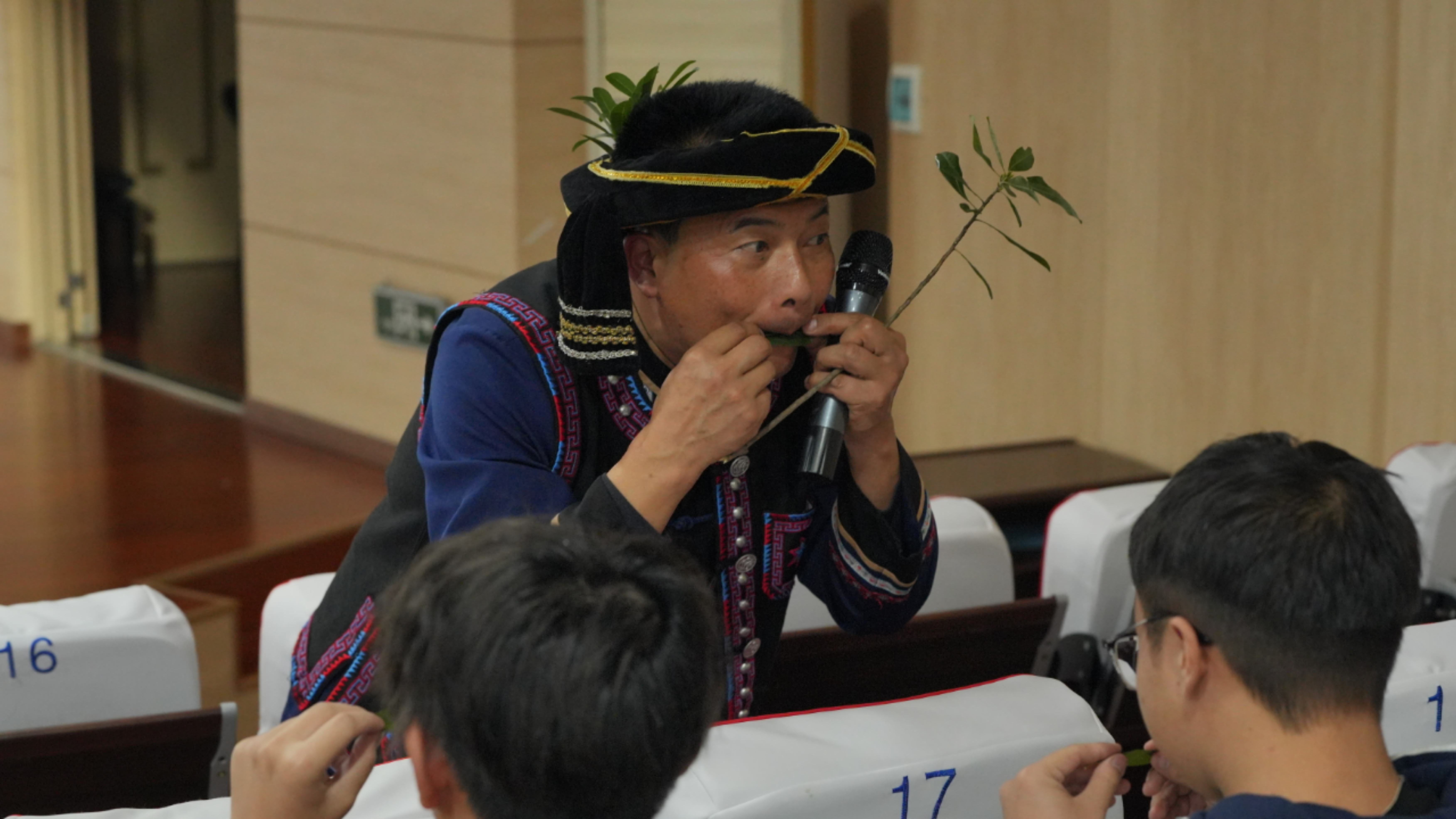杨昌鑫老师不仅展示了木叶独奏,还演示了如何用树叶模仿各种声音,甚至用不同种类的树叶吹奏出音色各异的乐曲。他解释道,树叶的选择、放置的位置、口型的变化以及气息的强弱,都是决定音色与音准的关键。高超的技艺、生动的演绎,让抽象的“非遗”概念化为了可听、可感的动人旋律,深深震撼了在场的每一位听众。