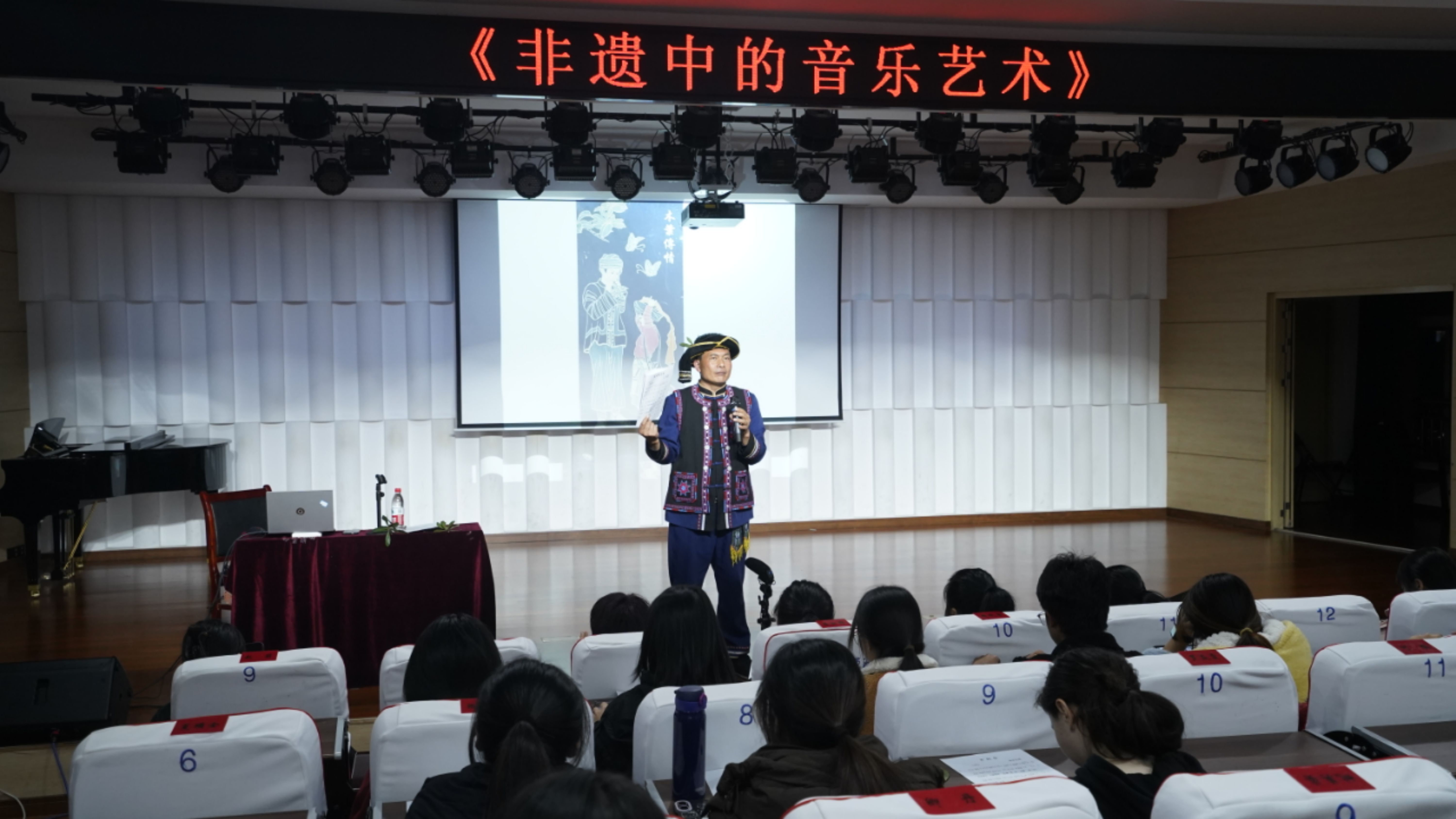 2025年11月20日晚7点,邵阳学院音乐舞蹈学院绿汀音乐厅内座无虚席,一场别开生面的非遗文化盛宴在此如期上演。省级非遗“木叶吹歌”传承人杨昌鑫先生应邀做客“绿汀讲堂”,为师生带来了题为《非遗中的音乐艺术》的精彩讲座。这不仅仅是一场传统的“你讲我听”的学术报告,更是一次“有吹、有教、有体验”的沉浸式音乐之旅,让古老的技艺在青春的校园里焕发出崭新的活力。