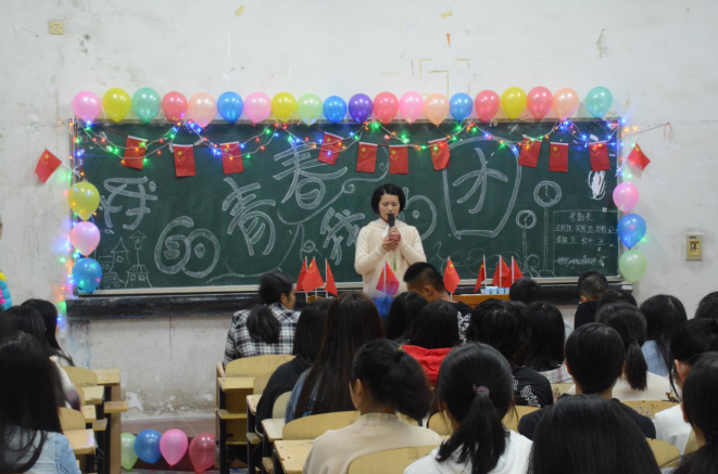 18级汉语言文学一班的教室黑板边缘挂满了气球,团干部站在插满五星红旗的讲台上向大家讲解共青团的光荣历史,同学们认真地倾听。18级新闻班的宣传委员向大家讲述如何成为一名合格的共青团员,同时提出要刻苦学习和规范自身行为的建议,并引领同学们唱中国共青团团歌,歌声回荡在18级新闻班的教室里。