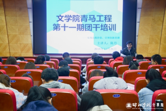为了提高学生干部的思想境界与工作能力, 11月26日晚7时,文学院在办公楼二楼报告厅开展青马工程第十一期团干培训。文学院副院长陈丹以“实现自我价值,引领创新思潮”为主题为同学们讲课。