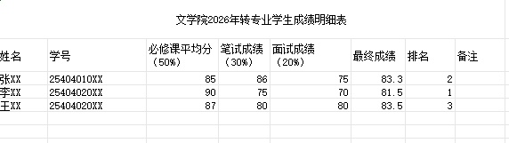 转专业名单按照已修读必修课程的平均成绩占比50%,转专业笔试、面试成绩占比50%(笔试成绩30%、面试成绩20%)加权计算总评成绩,根据总评成绩由高到低排序确定拟接收名单。占比50%。)