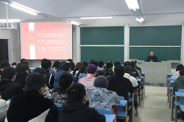 向文江结合具体事例,从习近平总书记“七一”重要讲话的时代背景、深刻内涵和青年学生应当担当历史使命三个方面,深入浅出的向师生解读了习近平总书记“七一”重要讲话精神;从鲜明揭示一个主题、深刻阐述四大成就、提炼概括一种精神、明确提出“九个必须”、深情发出一个号召等五个方面,对习近平总书记“七一”重要讲话的思想内涵进行了重点分析,强调学史力行就是坚持真理,践行初心,担当使命,不怕困难,英勇斗争,对党忠诚,不负人民。