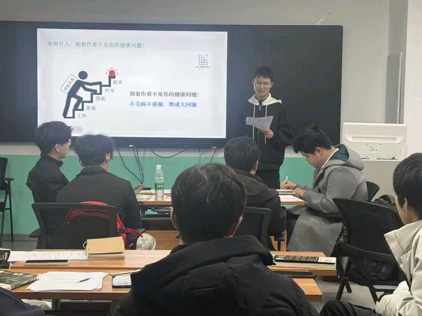 导读结束后,同学们自主推选组长,分组开展分章阅读与讨论,结合医学生学习生活实际梳理可落地的健康方法,围绕五色蔬菜饮食原则、碎片化运动、睡眠提升技巧等内容各抒己见。随后的组长代表发言环节,各组长登台分享小组心得,将健康理念与医学生学习、未来医疗职业生活结合,提出了利用实验间隙运动、睡前远离电子设备等贴合实际的健康规划,让健康理念变得具体可感。