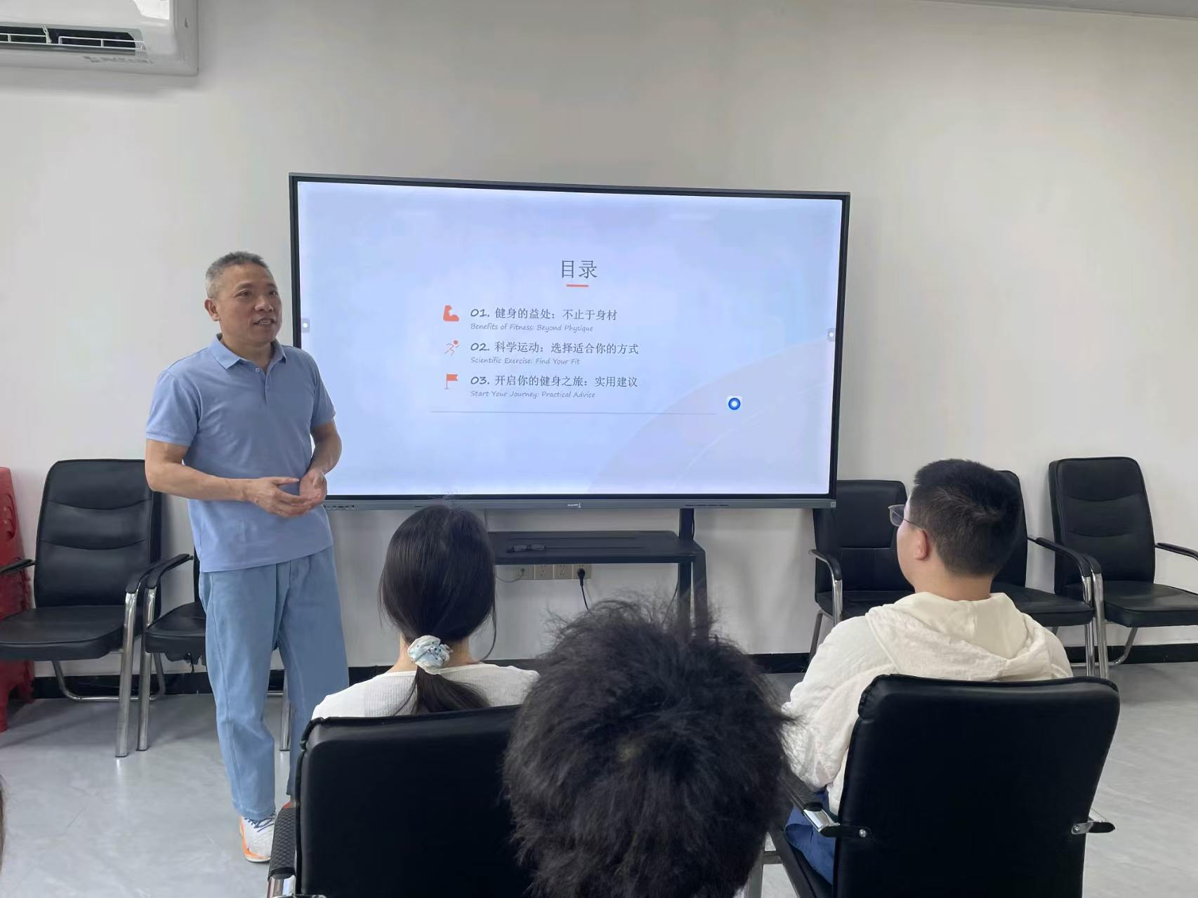 贺书记为营员授课并讲话。她结合当前国民健康数据指出,我国成年人超重肥胖问题突出,科学减重可显著降低脂肪肝、高血压、糖尿病风险。本次活动既是帮助师生管理体重、改善体态,更是在校园普及健康理念。她强调,健康没有捷径,唯有坚持,希望全体营员以科学饮食为基础、规律运动为支撑,自律自强、持之以恒,在21天挑战中收获成长与蜕变。 余贵平副院长围绕科学运动与健康管理作指导。他介绍,本次减重营以“科学减重+运动赋能”为特色,提供个性化运动方案:有氧运动燃脂护心肺,力量训练增肌提代谢,柔韧性训练舒缓放松。大体重营员从快走、游泳等低冲击运动起步,减脂期采用有氧+力量结合模式,遵循循序渐进、安全运动原则。同时搭配科学饮食与社群打卡,帮助大家轻松养成健康习惯,高效达成目标。
