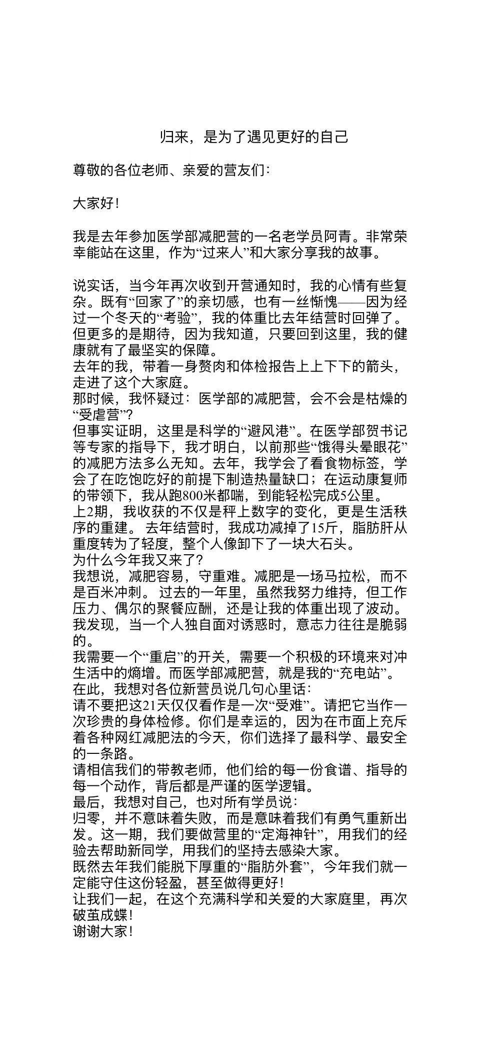 仪式最后,全体营员庄严宣誓:“我自愿加入健康减重营,从今天起,坚持科学饮食,拒绝不良习惯;坚持规律运动,绝不轻言放弃;相互鼓励,共同进步;为遇见更健康、更优秀的自己而全力以赴!”铿锵誓言彰显全体营员挑战自我、践行健康的坚定决心。 本次21天快乐打卡健康减重营,以医学专业为支撑,以政策号召为导向,以社群陪伴为抓手,将科学饮食、规律运动、健康管理深度融合,切实帮助师生破解“减重难、坚持难”问题,在校园营造爱健康、爱运动、乐打卡的积极氛围,为建设健康校园、落实健康中国战略注入青春动能。