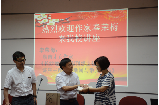会上,奉荣梅老师就新闻写作与散文写作两方面作了生动诠释。在新闻写作上:就采访实践、标题制作、培养新闻发现的能力三方面讲述了自己的心得和实战经验,并以采访残雪,从最初被采访者的拒绝,到建立两人的深厚情谊,最后残雪接受采访这一真实例子生动地做了解释说明。在散文写作这方面,从注重散文标题制作、散文构思两方面进行了讲解。此外,奉荣梅老师还就学生新闻实习应注意的事项提出了具体的要求。