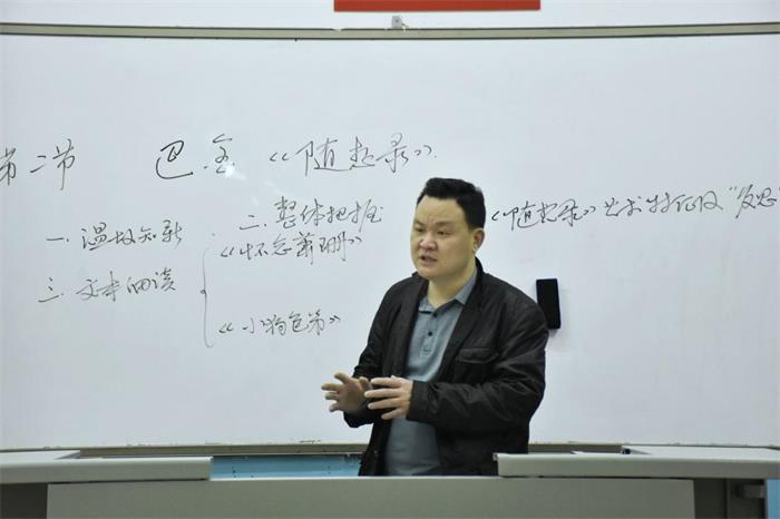 在各参赛老师决定好讲课顺序后,选拔赛正式开始。袁龙老师首先上台,他在回顾上节课的内容后,引入本节课的主要内容:巴金的《随想录》,并通过细读巴金的两篇文章《怀念萧珊》与《小狗包弟》,展现了《随想录》的艺术性。